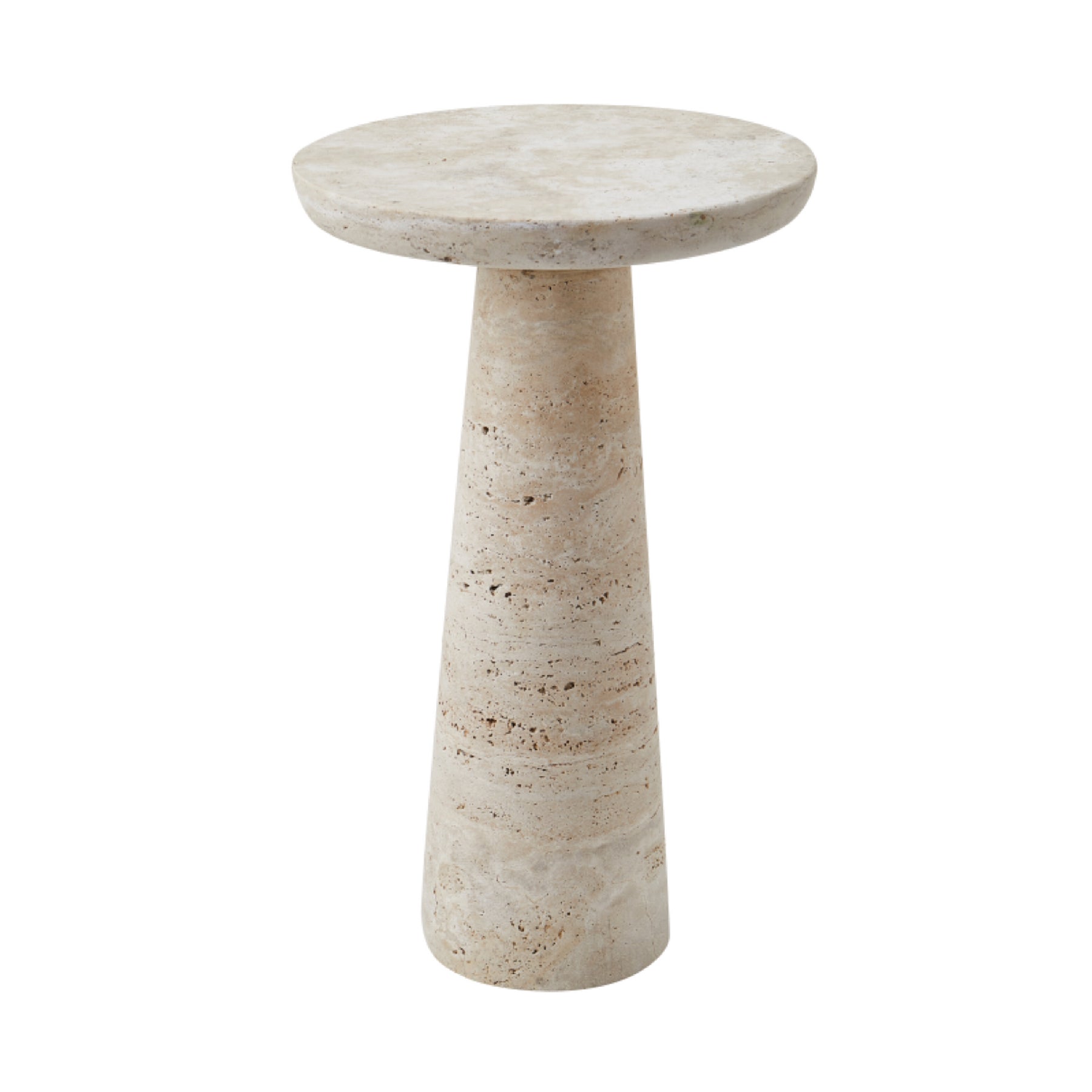 The round tabletop provides a perfect surface for placing your favorite books, a cup of coffee, or decorative items, while the tapered pedestal base adds a touch of elegance and stability. The neutral color palette of the travertine allows it to effortlessly blend with various interior styles, from minimalist to eclectic.