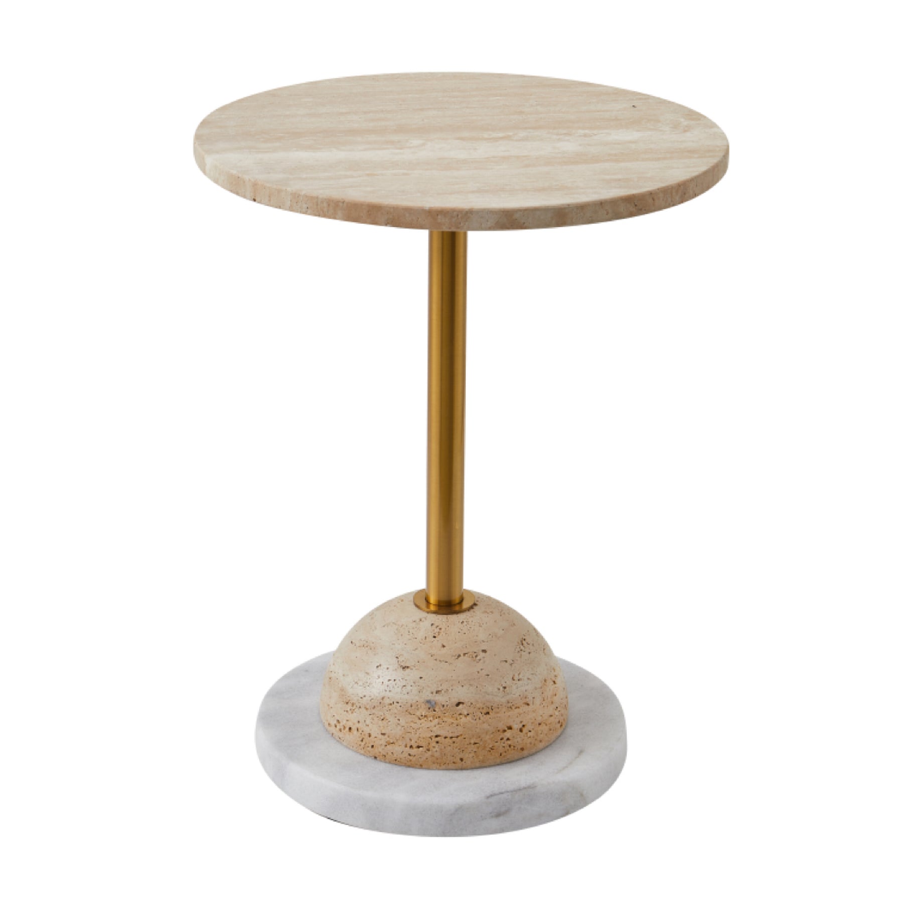 Connecting the tabletop and the base is a sleek gold metal rod, which adds a touch of luxury and elegance to the overall design. The base consists of two parts: the upper part is a travertine hemisphere, echoing the tabletop material and maintaining design consistency; the lower part is a white marble circular base, which contrasts with the travertine, creating a visually layered effect.